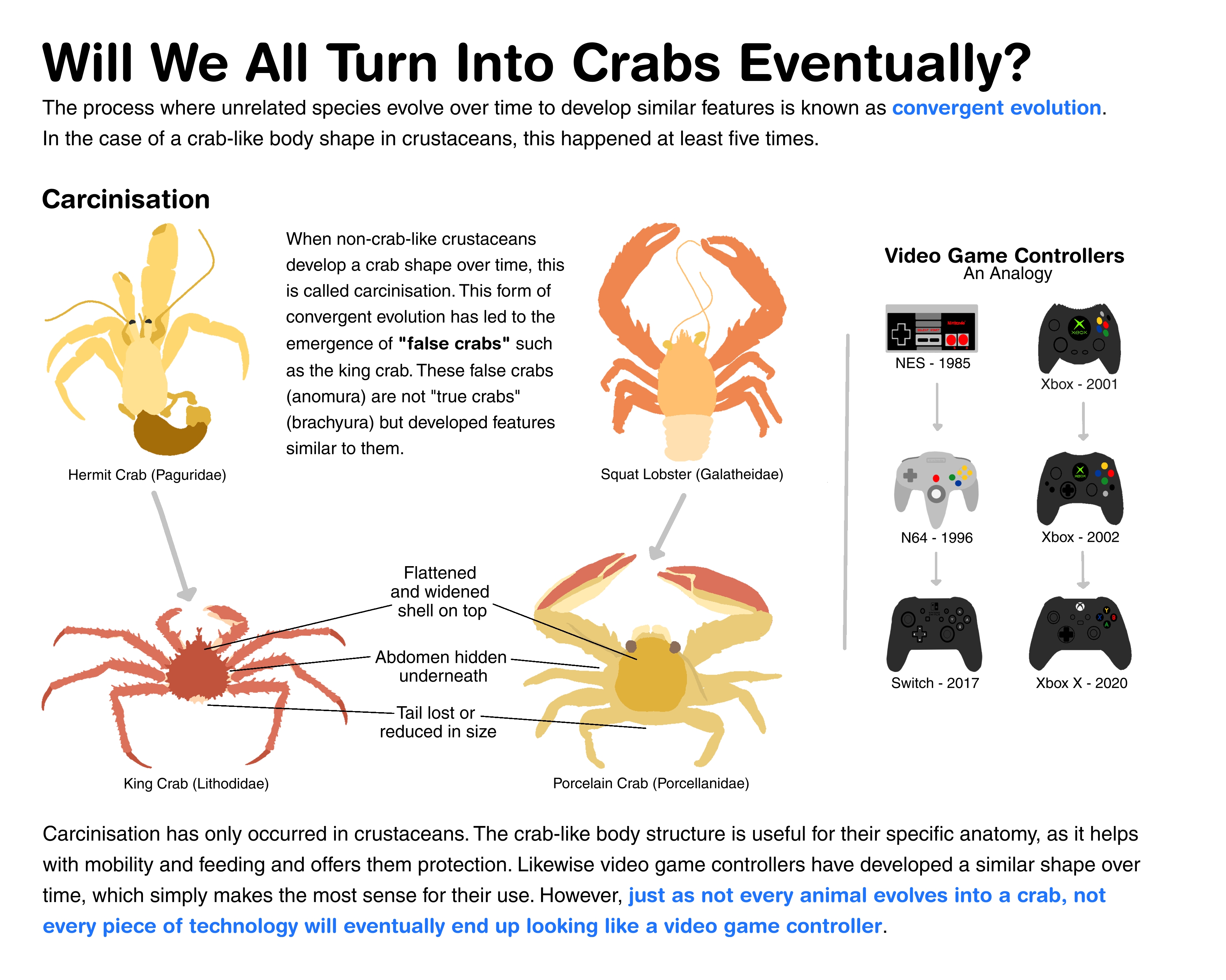 ![Will We All Turn Into Crabs Eventually? The process where unrelated species evolve over time to develop similar features is known as convergent evolution. Carcinisation. When crab-like crustaceans do not develop a crab shape over time, this is called carcinisation. This form of convergent evolution has led to the emergence of "false crabs" such as the king crab. [hermit crab and an arrow pointing to a king crab & squat lobster and an arrow pointing to a porcelain crab] Video game controllers. [NES, N64 & Switch on the left & xbox on the right] Carcinisation has only occurred in crustaceans. The crab-like body structure is useful for their specific anatomy, as it offers them protection, helps with mobility and feeding. Video game controllers have developed a similar shape over time, which simply makes the most sense for their use. However, just as not every animal evolves into a crab, not every technology will eventually end up looking like a video game controller.](carcinisation.jpg)