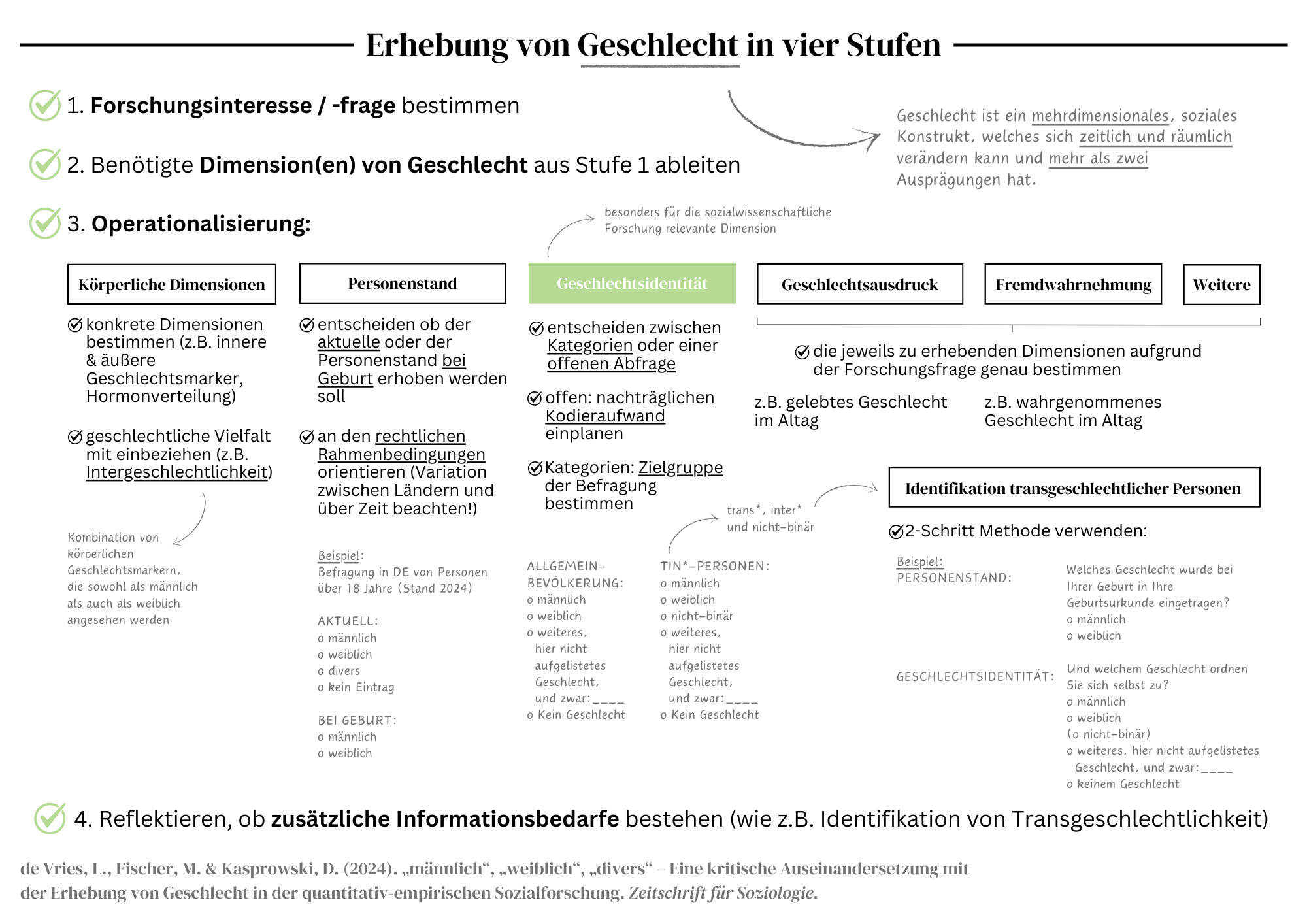 - de Vries, L., Fischer, M. & Kasprowski, D. (2024). „männlich“, „weiblich“, „divers“ – Eine kritische Auseinandersetzung mit der Erhebung von Geschlecht in der quantitativ-empirischen Sozialforschung. Zeitschrift für Soziologie.